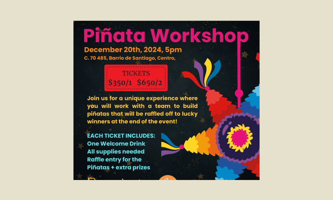 Piñata Workshop will take place at Brewjeria Cocina y Bar on December 20th at 5 PM, offering a fun evening of crafting colorful piñatas to be raffled off at the end. Tickets include supplies, a welcome drink, and entry into the raffle, priced at $350 pesos for one person or $650 pesos for two.
