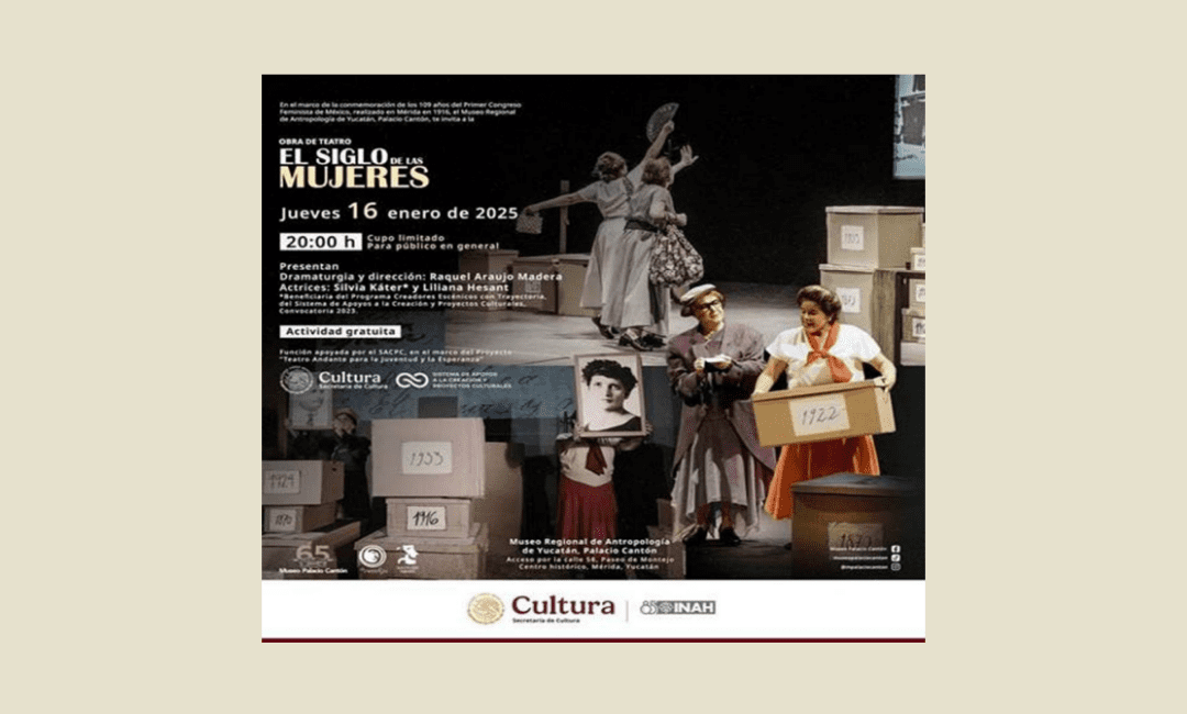 The play The Century of Women will be presented on Thursday, January 16, 2025, at 8:00 PM at the Museo Regional de Antropología, Palacio Cantón. This free event, directed by Raquel Araujo Madera and performed by Silvia Káter and Liliana Hesant, explores women’s experiences and their historical impact, with limited capacity for the general public.